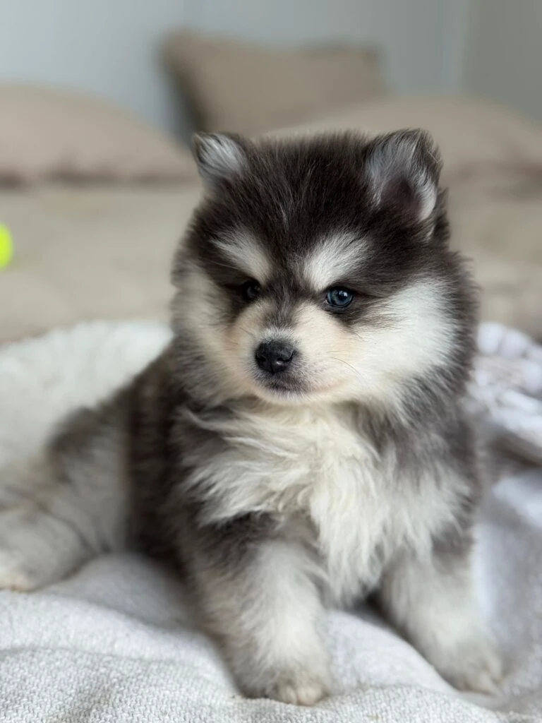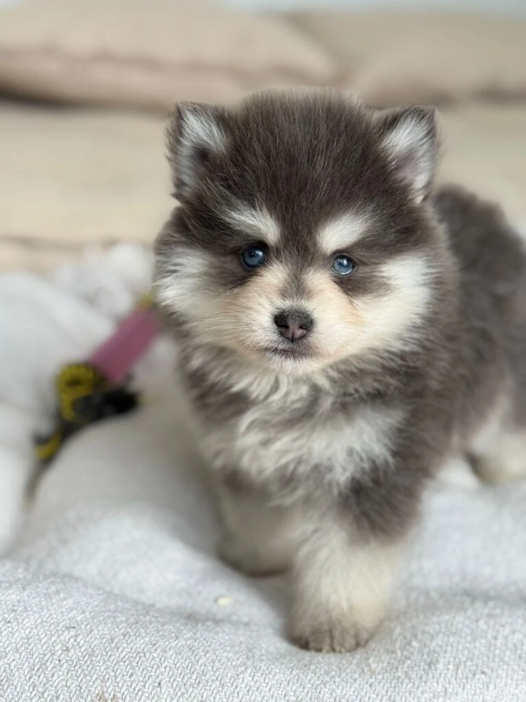 Batcha est une magnifique Pomsky bleu aux yeux bleus.